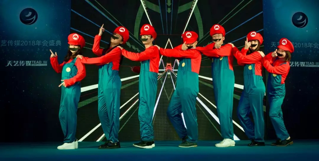舞臺燈光驟然熄滅,再次點(diǎn)亮?xí)r,一群紅帽紅衣戴著大胡子的馬里奧“叔叔”出現(xiàn)啦!