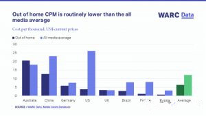 來自WARC媒體成本數(shù)據(jù)庫的數(shù)據(jù)顯示,除了澳洲和英國,戶外在全球主要市場的千人成本一般比所有媒體的平均千人成本都要低。