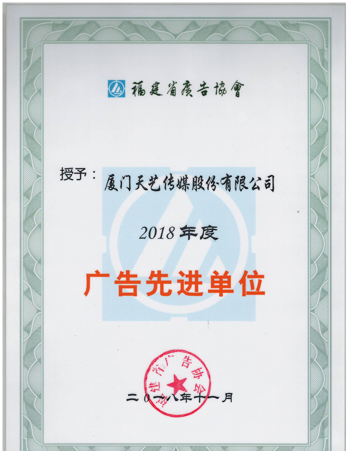 2018年福建省廣告界在推動廣告業(yè)發(fā)展中,勇于開拓,努力創(chuàng)新,取得了優(yōu)異的成績,為福建經(jīng)濟發(fā)展和社會進步作出了巨大貢獻(xiàn),涌現(xiàn)了一批先進單位。為了表彰先進,樹立典型,推動工作,再創(chuàng)輝煌,福建省廣告協(xié)會于12月20日舉辦了第七屆第三次理事會,并授予了廈門市天藝傳媒股份有限公司“福建省廣告先進單位”的稱號。